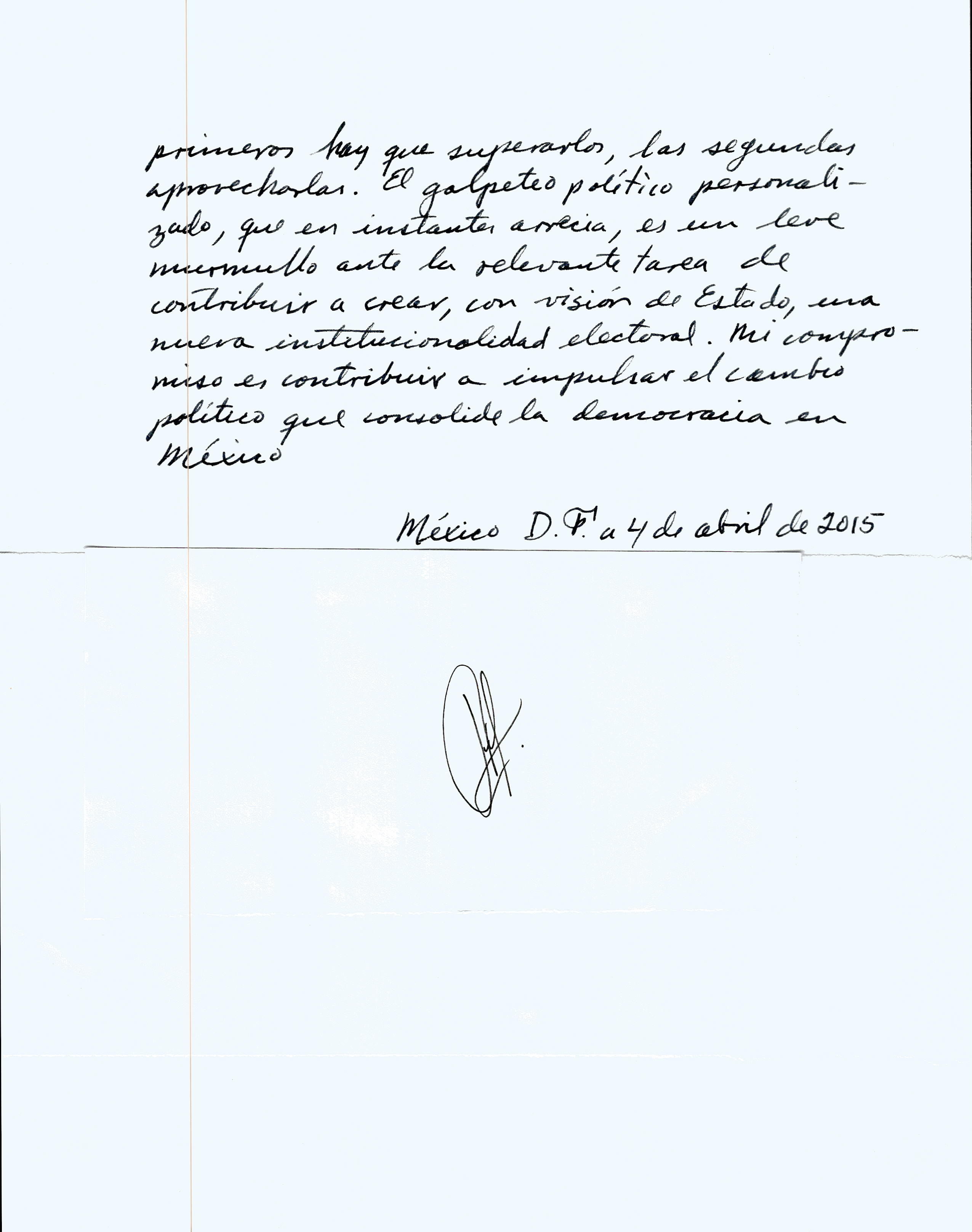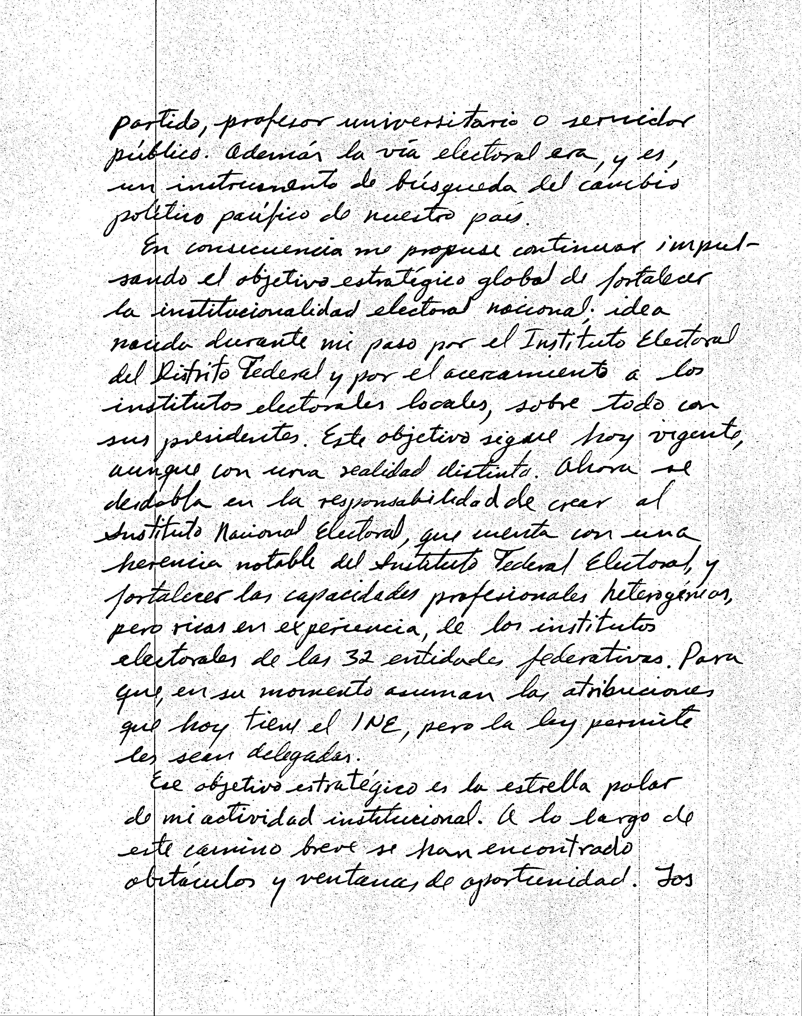 Ese objetivo estratégico es la estrella polar de mi actividad institucional. A lo largo de este camino breve se han encontrado obstáculos y ventanas de oportunidad. Los primeros hay que superarlos, las segundas aprovecharlas. El golpeteo político personalizado, que en instantes arrecia, es un leve murmullo ante la relevante tarea de contribuir a crear, con visión de Estado, una nueva institucionalidad electoral. Mi compromiso es contribuir a impulsar el cambio político que consolide la democracia en México.