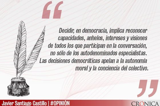 Decidir, en democracia, implica reconocer capacidades, anhelos, intereses y visiones de todos los que participan en la conversación, no sólo de los autodenominados especialistas. Las decisiones democráticas apelan a la autonomía moral y la conciencia del colectivo; el “gobierno de los que saben” es, por definición, elitista, arrogante y, finalmente, portador de un interés particular que no se atreve a decir su nombre.
